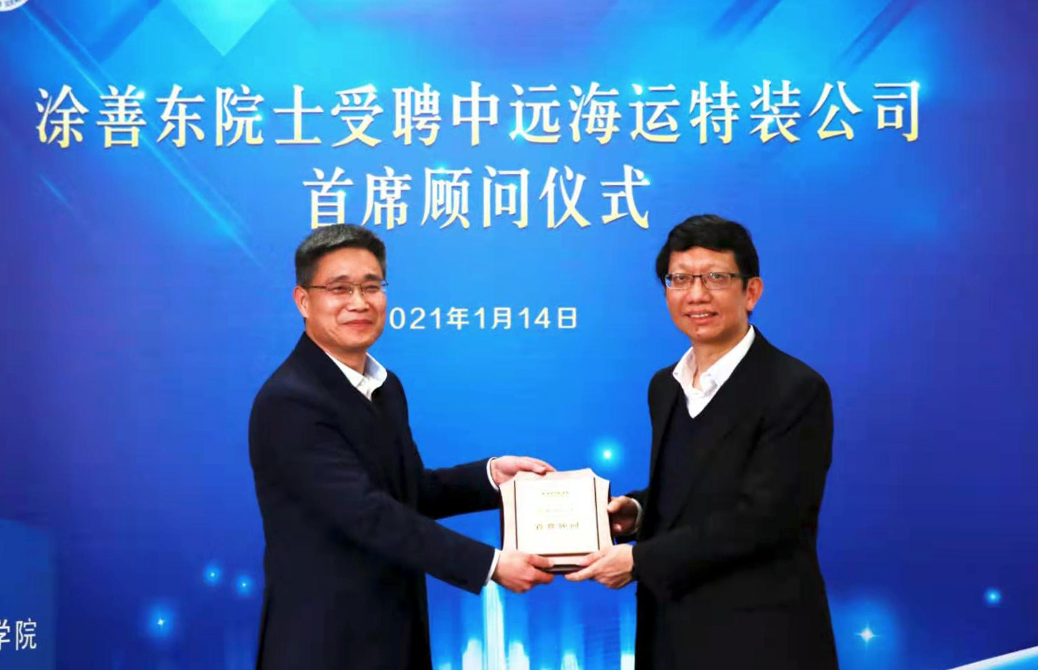 1月14日,中国工程院院士涂善东接受物流球友会app最新版下载,球友会(中国)属中远海运特装公司聘请,担任公司首席顾问。交通控股球友会app最新版下载,球友会(中国)总经理、中远海运特装公司董事长仲伟涛为涂善东院士颁发聘任牌匾。
