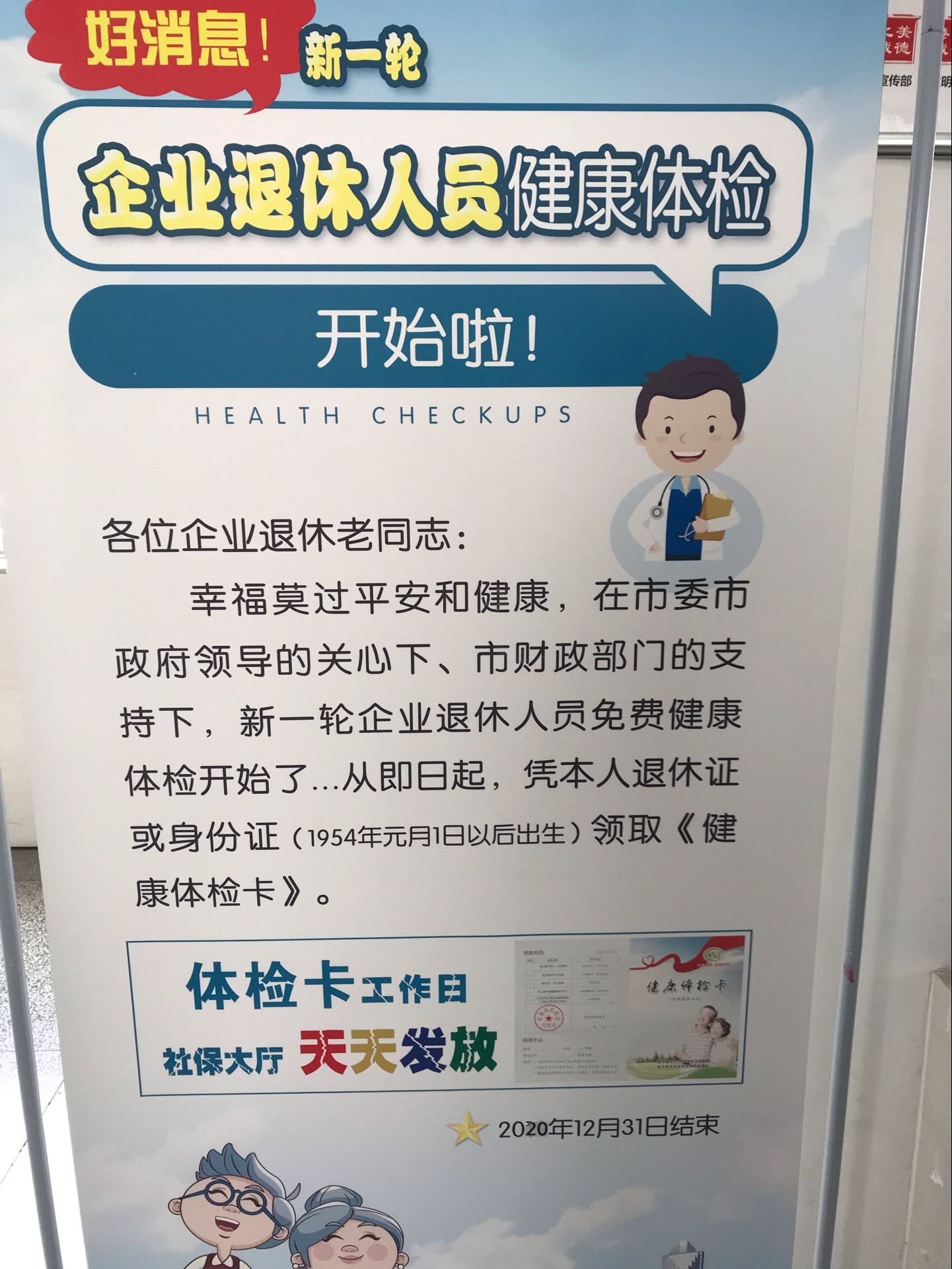 为进一步保障退休职工的身体健康,6月10日,汽车公司从人社局获悉,新一轮的退休体检已经开始,凡参加市区基本养老保险年龄在65周岁以内,已于本年度之前办理退休手续,且纳入社会化管理的企业退休人员,均可到市人社局社保服务大厅领取《健康体检卡》,体检卡发放截止日期到2020年12月31日,凡符合条件的退休人员凭《健康体检卡》可享受免费的健康体检服务。