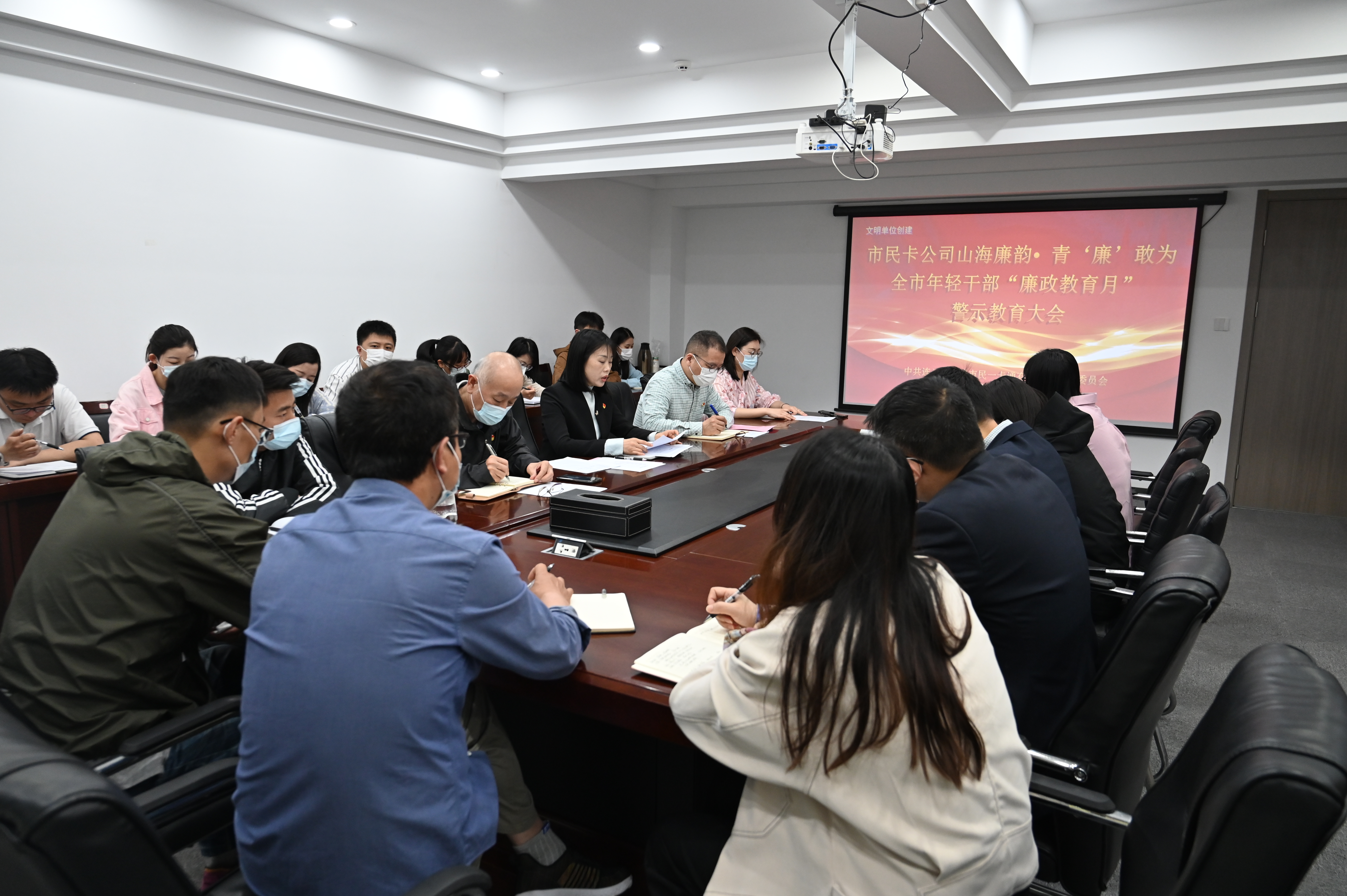 为深入学习贯彻习近平总书记关于加强年轻干部教育管理 监督的重要论述,引导年轻干部扣好廉洁从政“第一粒扣子”,更加积极主动践行“四敢”精神。5月22日上午,市民卡公司党支部组织召开“山海廉韵·青‘廉’敢为”全市年轻干部“廉政教育月”警示教育会议,公司领导班子成员、中层干部、党员及85后职工参加会议。支部书记叶星妍主持会议。