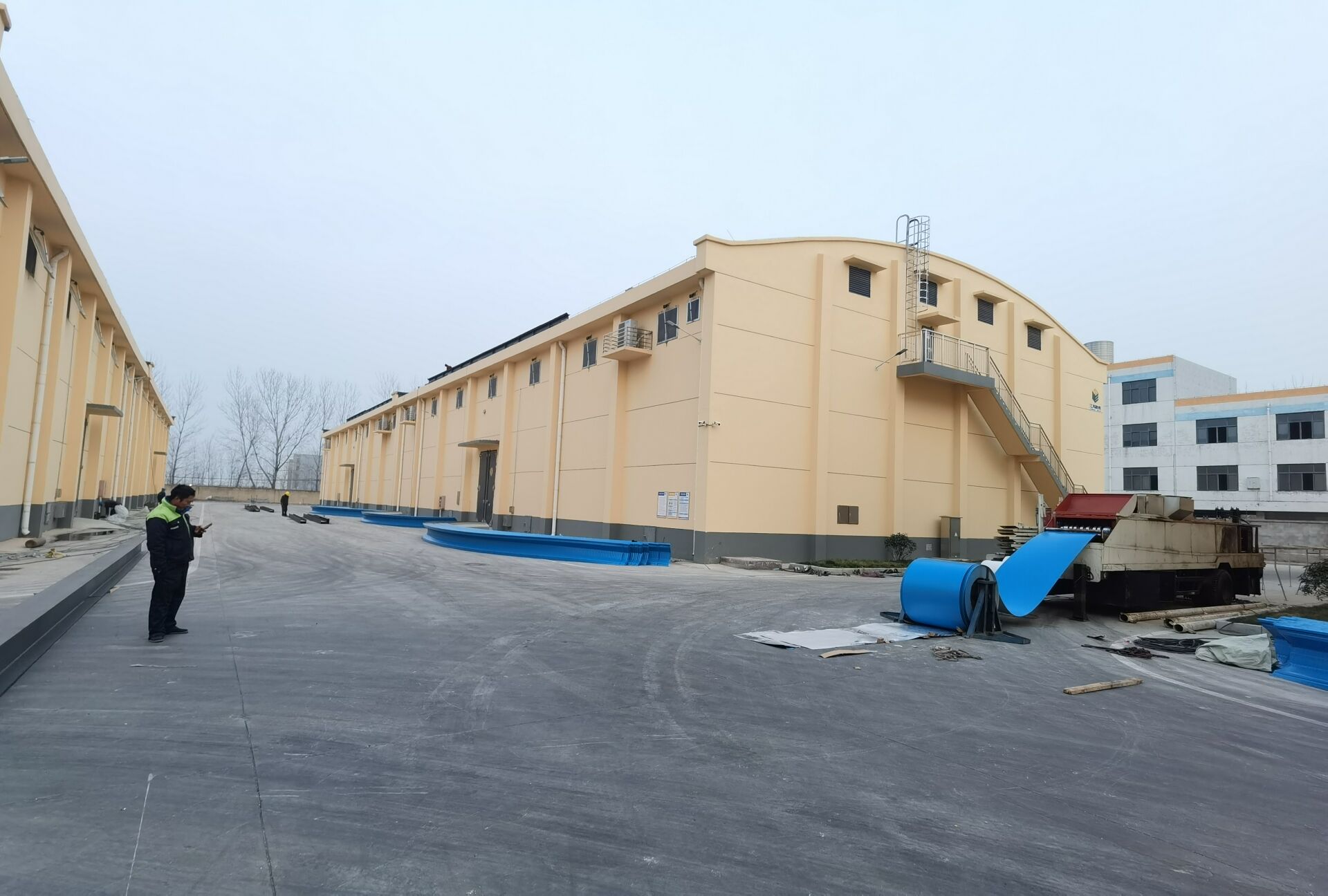 现工程已全面开工,屋顶拱形屋面材料已制作完成,正在焊接两侧钢梁,待焊接完成进行吊装作业。公司总务处对施工安全问题高度重视,令施工方作业前上报施工方案,签订安全责任书,所有施工场地人员均佩戴安全帽,高处施工人员需佩戴安全绳,保证施工作业安全。预计该工程元旦前后即可施工完成。
