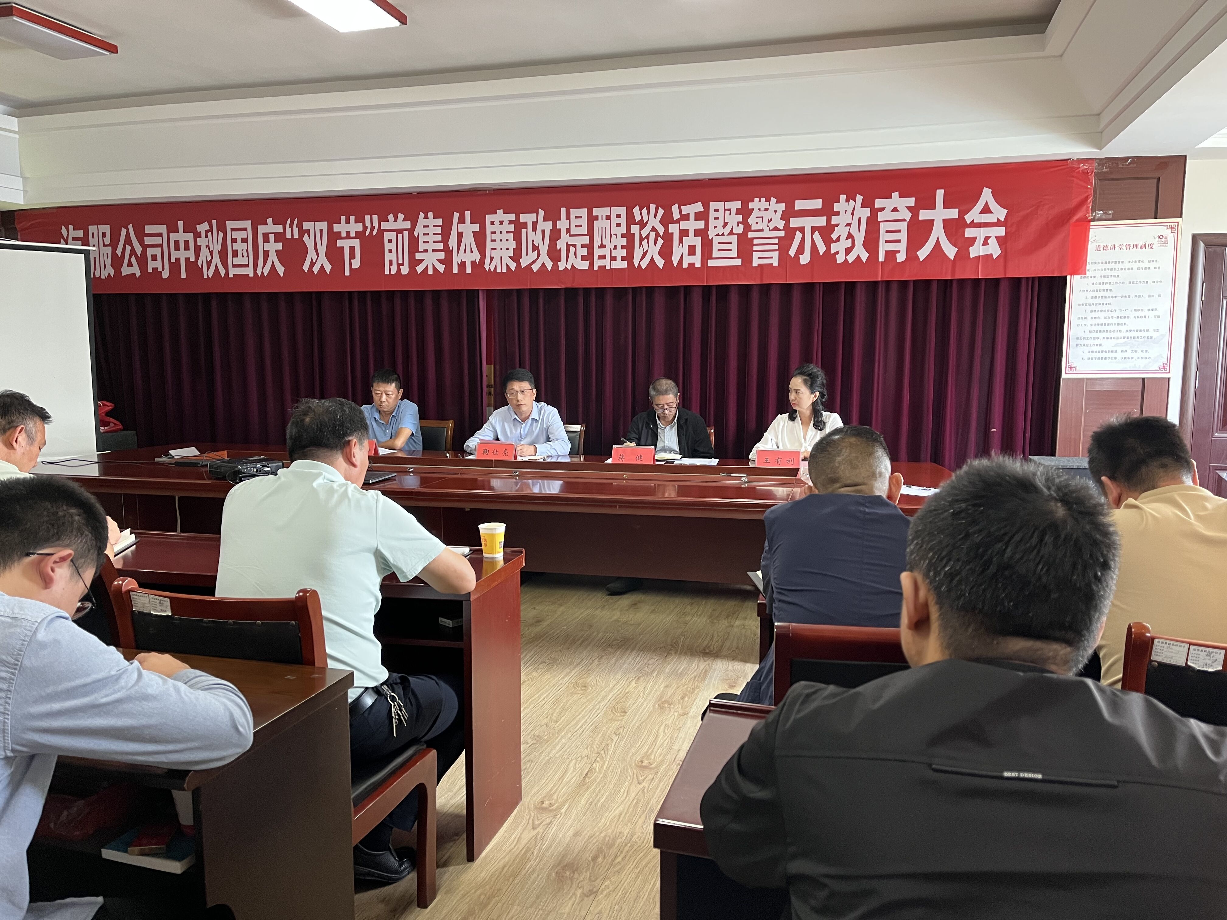 会上,大家集体观看了警示教育视频《铁规距 硬杠杠》;蒋健同志传达市纪委《2023年中秋、国庆节点纠“四风”树新风工作提示》;公司党委书记、总经理鞠仕亮开展了“中秋”“国庆”节前廉政提醒谈话。