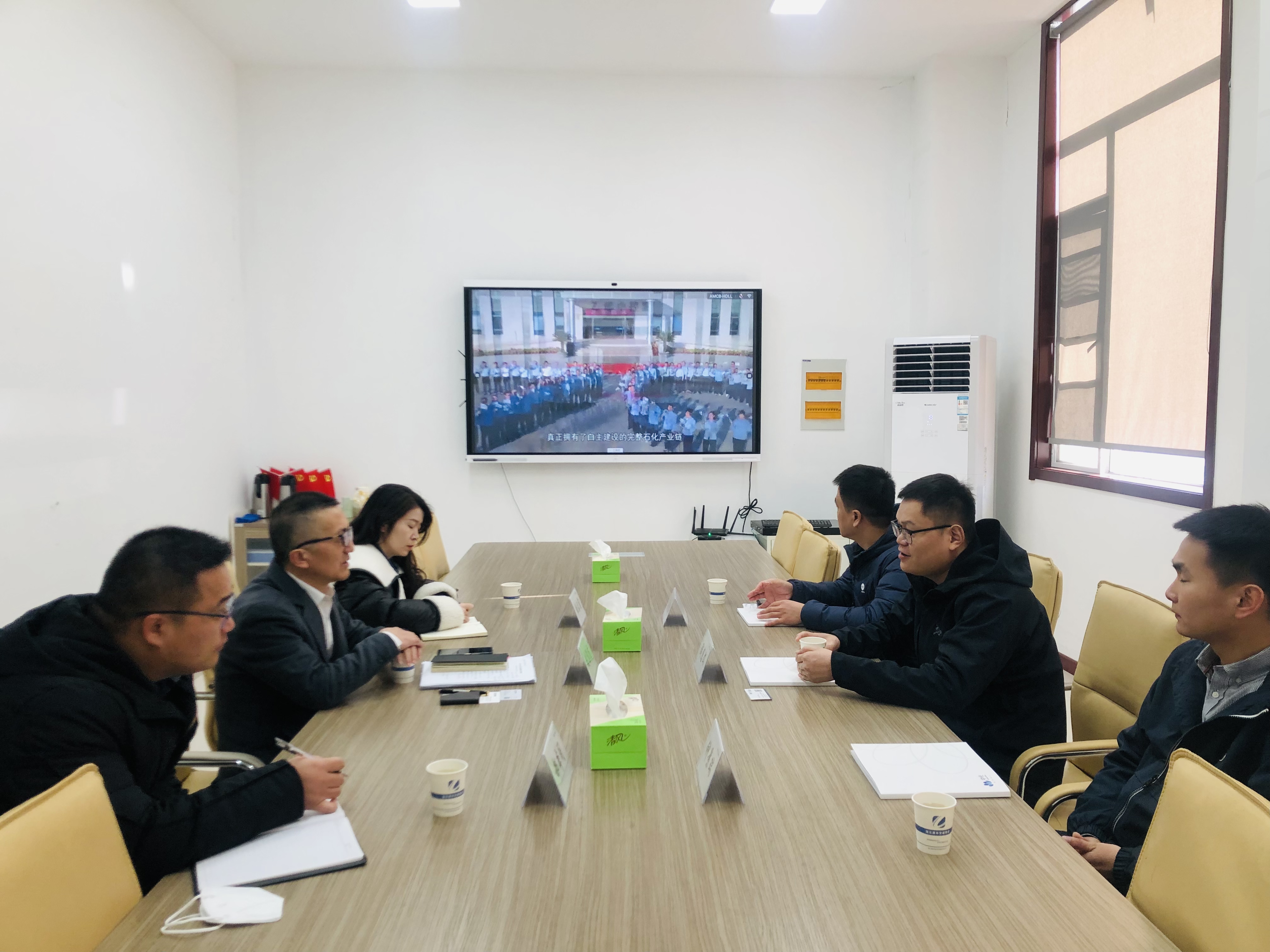 2月14日上午,山东京博石化中部大区总经理陶惠文一行3人到中化交控能源公司交流洽谈,中化交控能源公司总经理刘苏龙携业务团队接洽。