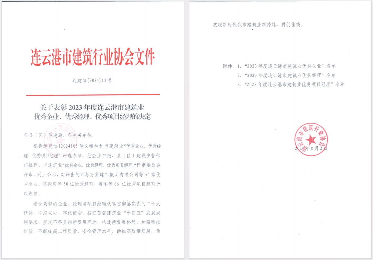 近日,从连云港市建筑业协会获悉,海建公司获评“2023年度连云港市建筑业优秀企业”,同时,海建公司党委书记、董事长于振国获评“2023年度连云港市建筑业优秀经理”,徐其翔、薛峰、徐永远、苏陈获评“2023年度连云港市建筑业优秀项目经理”。