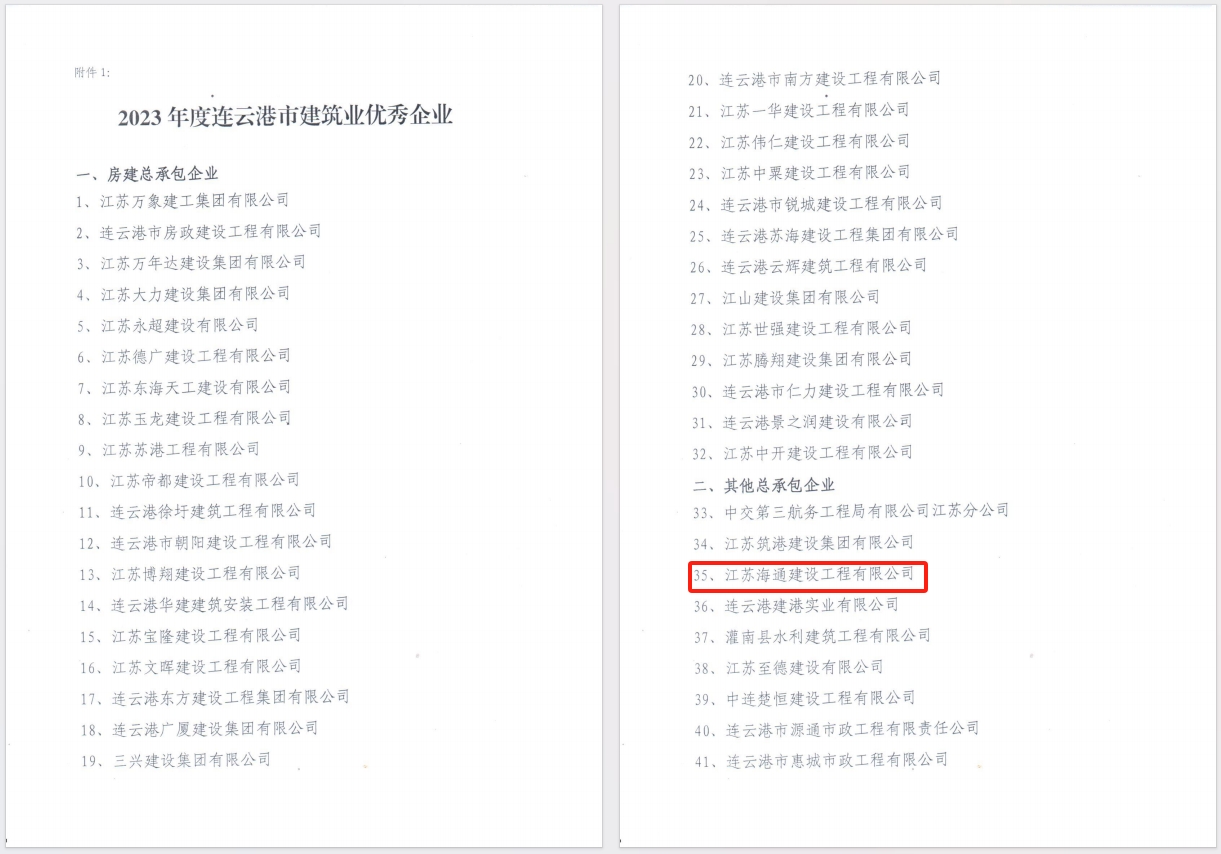 近年来,海建公司认真贯彻落实党的二十大精神,按江苏省建筑业“十四五”发展规划要求,坚定不移贯彻新发展理念,充分发挥公司优势,不断提升经营质效,坚持创新驱动绿色发展,着力提升建筑品质,连续三年以“施工总承包”企业类别成功入选年度市建筑业优秀企业名单。