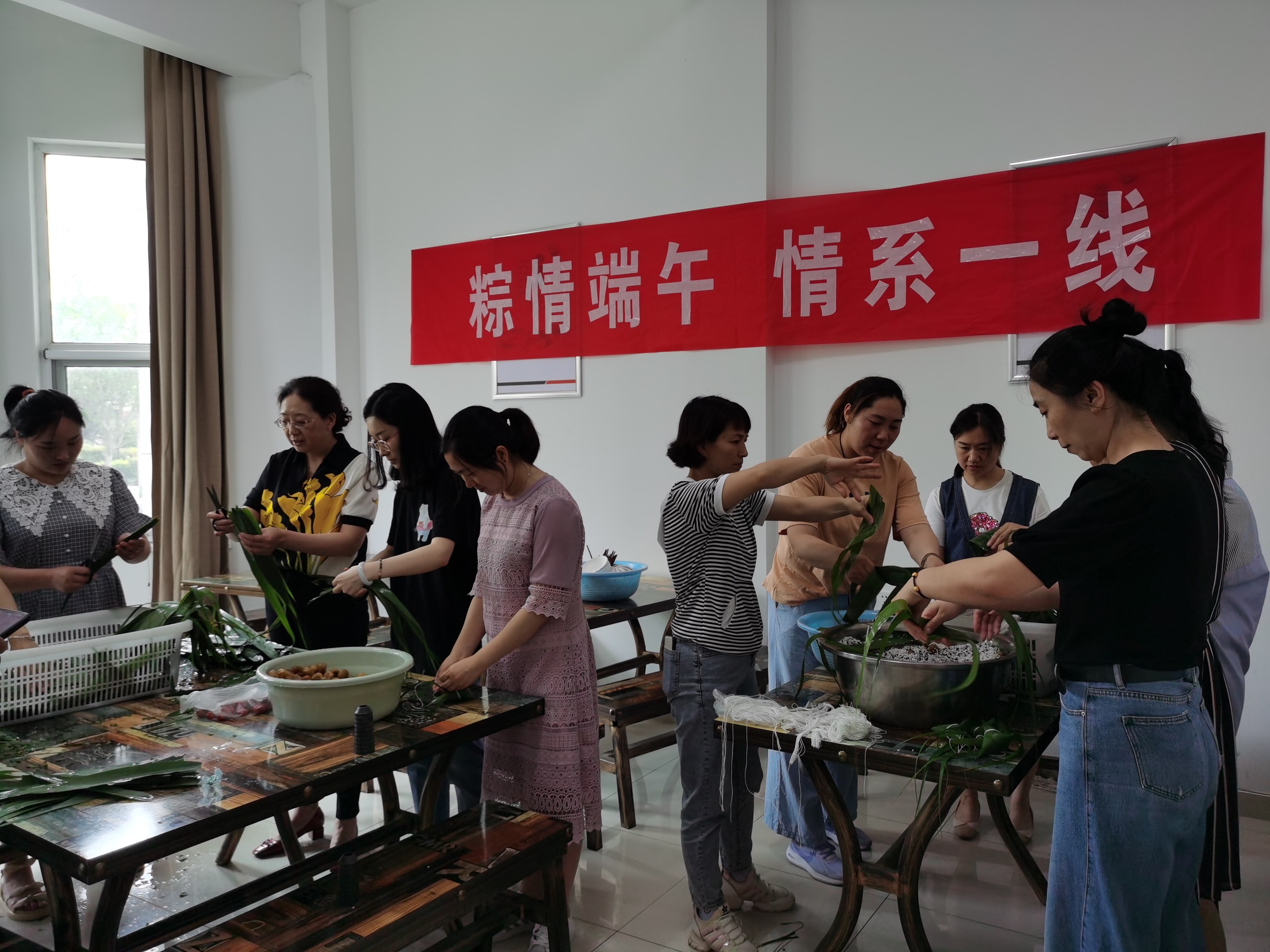 6月10 日上午,交建分公司组织女职工来到江苏大道项目部食堂,大家分工明确,有烫粽叶的,有淘米的,有剪粽绳的,一时间粽叶舞动,麻绳穿梭,只见有的将粽叶卷成漏斗状后,用糯米充实压紧,再用细绳打个结,动作干净麻利;有的因为没经验,绳子还没来及扎,粽叶就散了,糯米撒了一桌,现场时不时传出一阵阵欢声笑语。