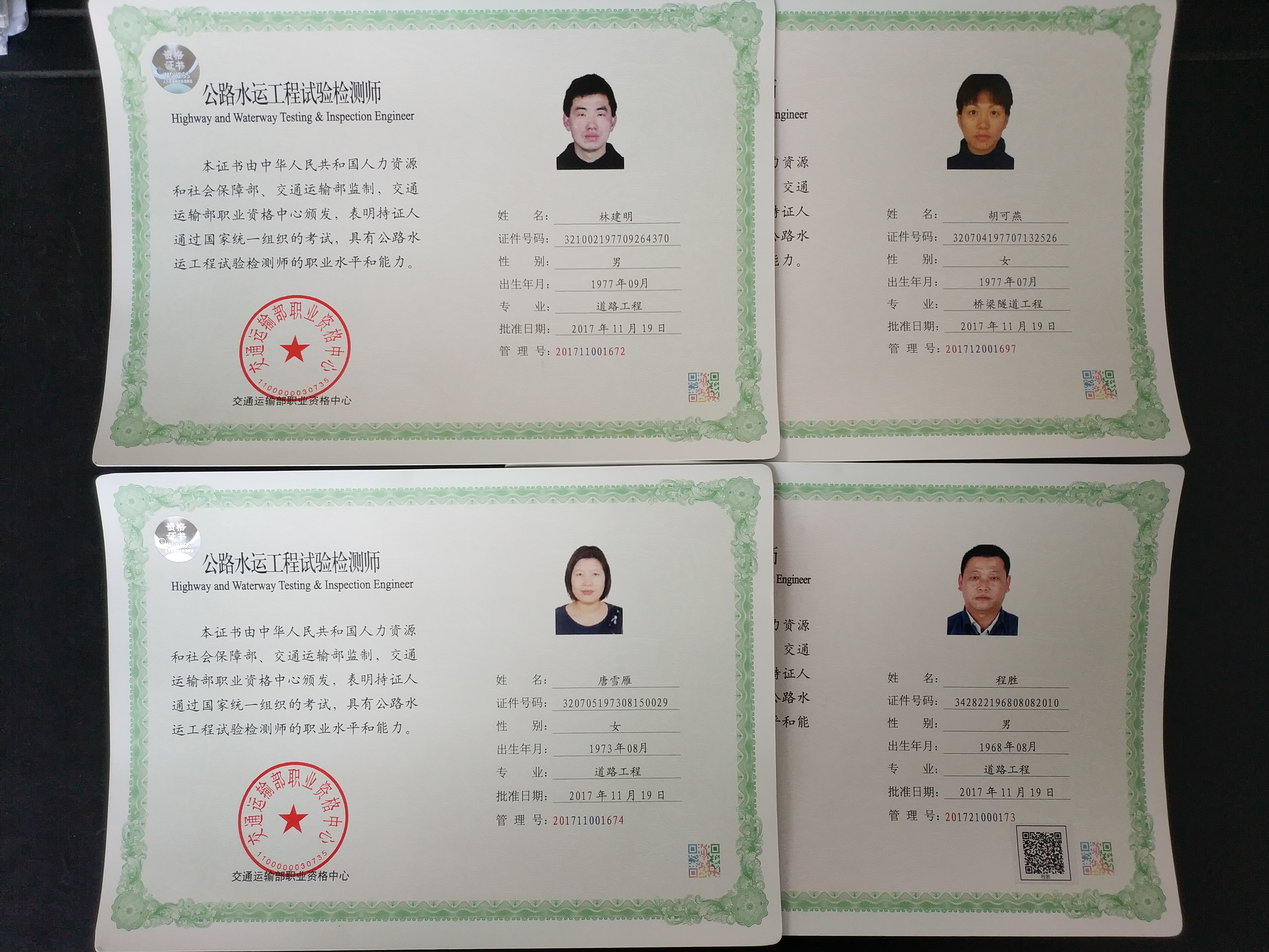 近期,江苏海建新丝路检测公司4位同志通过了由人力资源社会保障部和交通运输部共同组织的公路水运工程试验检测职业资格考试,其中林建明、唐雪雁、胡可燕三位同志获得了公路水运工程试验检测师资格证书,程胜获得了公路水运工程助理试验检测师资格证书。