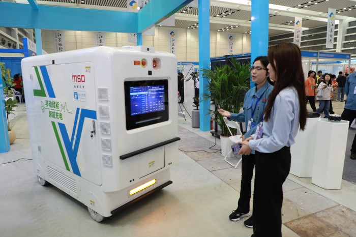 现场的海宏科技充电移动机器人移动演示吸引了众多参观者驻足观看并打卡拍照。其高效便捷的充电方式和智能化的操作流程,展示了公司在智能充电领域的创新实力和对绿色出行未来的积极探索,成为展会的一大亮点。MSO移动充电机器人搭载了全球同类设备中最大容量的209kWh磷酸铁锂储能电芯,采用120kW液冷快充,在同类产品中处于领先位置,同时移动充电机器人输出电压支持1000v的高压平台。在硬件上,是全球唯一一家采用伺服驱动麦克纳姆轮方案,可以实现360°全方位旋转以及平移、侧移,对通过狭小空间极具优势,满足不同场景需求,极大简化自动驾驶逻辑。车身搭载激光雷达、超声波避障以及360°环视;基于硬件,可实现低速自动驾驶与5G云驾驶,同时融合了分布式储能、快速充电桩与移动机器人的产品属性,颠覆传统车找桩模式,开启新能源时代桩找车的全新生活方式。