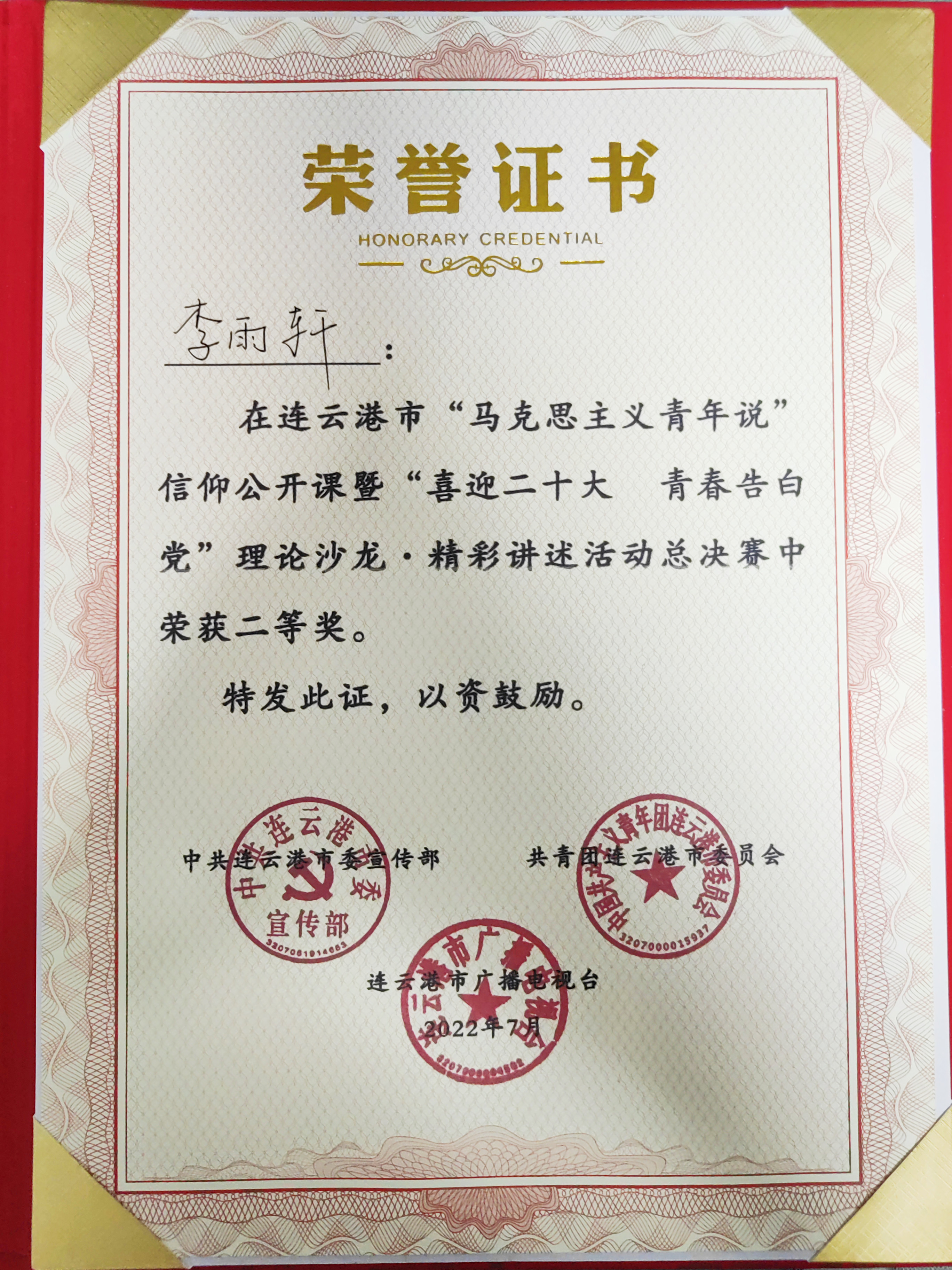 为深入学习宣传贯彻习近平新时代中国特色社会主义思想和党的十九届会议系列精神,不断推进马克思主义中国化、时代化、大众化,以实际行动迎接党的二十大胜利召开,7月27日,由市委宣传部、团市委、市广播电台联合举办的全市“马克思主义青年说”信仰公开课暨“喜迎二十大 青春告白党”理论沙龙?精彩讲述活动总决赛在市广播电台举行。连汽新浦汽车站总站“雷锋车”手李雨轩在此次比赛中荣获二等奖。